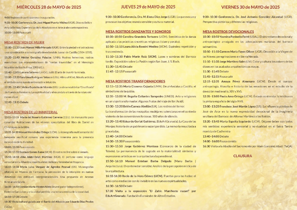 Bajo el título «Los rostros de lo sensorial: las experiencias religiosas en las Artes» se acoge un variado conjunto de puntos de vista, desde la danza, la luz, la música, la antropología, la historia, los estudios bíblicos, el simbolismo cromático, la literatura, la contemporaneidad, las ciencias de